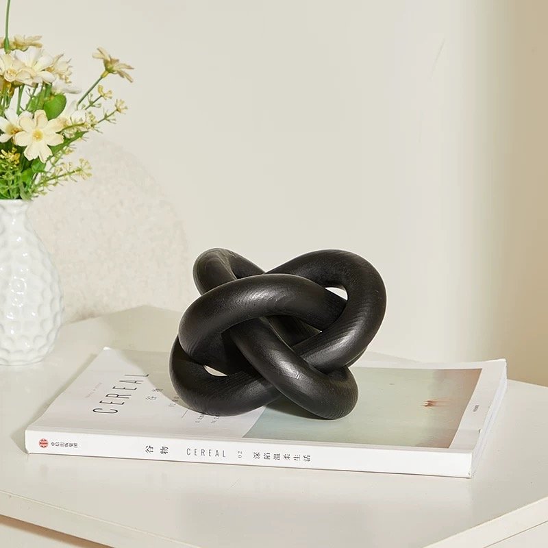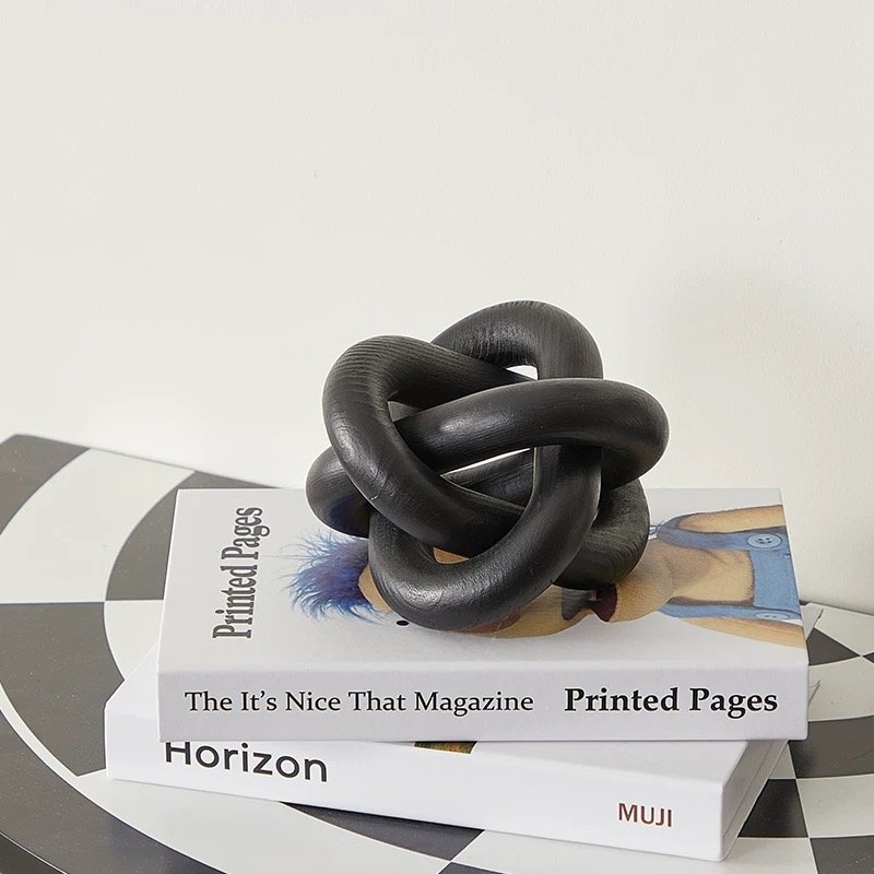 A modern black knot sculpture crafted in a smooth matte finish. This compact yet bold accent adds a touch of abstract art to bookshelves, coffee tables, or console styling