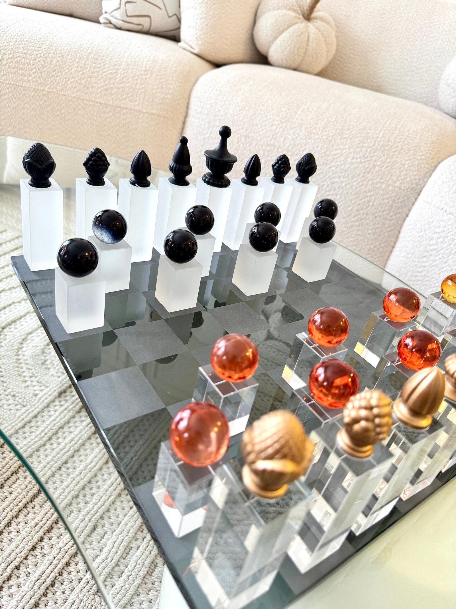 A luxurious chess set featuring bronze and black pieces mounted on clear crystal bases, paired with a sleek matte board. A sophisticated centerpiece that blends modern design with timeless play.