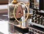 A stylish decorative clock combining rich wood texture with gold detailing, set in a circular gold frame and mounted on a black and gold base. A refined statement piece for consoles, desks, or living rooms.